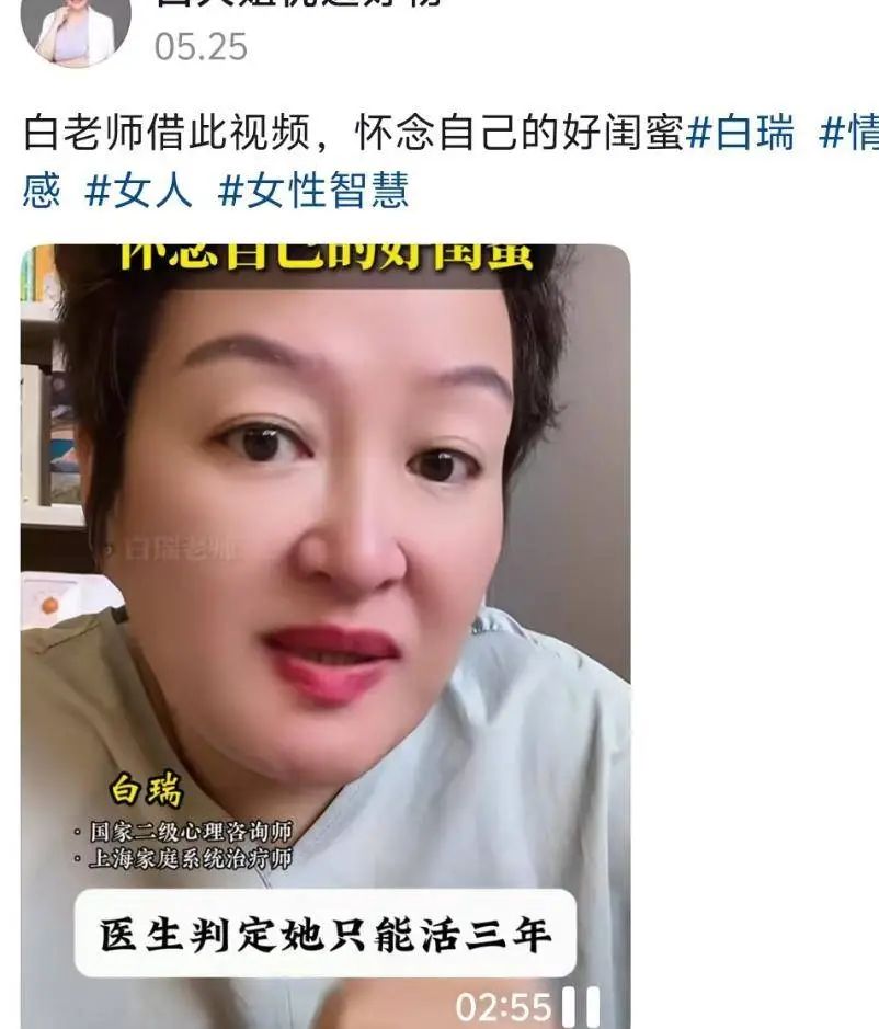 国家二级心理咨询师白瑞发布视频悼念,称其为挚友,并讲述她抗癌背后的诸多艰辛。