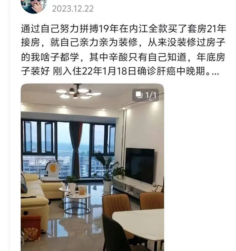 其人生坎坷,刚购置新房便确诊肝癌中晚期,今年 4 月为治病卖房。